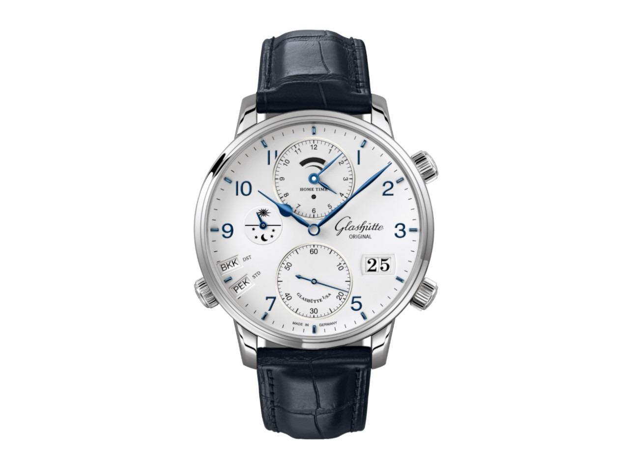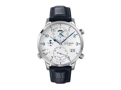 Glashütte Original Senator Cosmopolite Automatik Edelstahl 44mm weißes Zifferblatt blaues Lederband