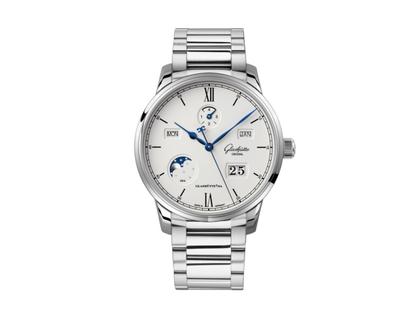 Glashütte Original Senator Excellence Ewiger Kalender Automatik Edelstahl 42mm silberweißes Zifferblatt Metallband