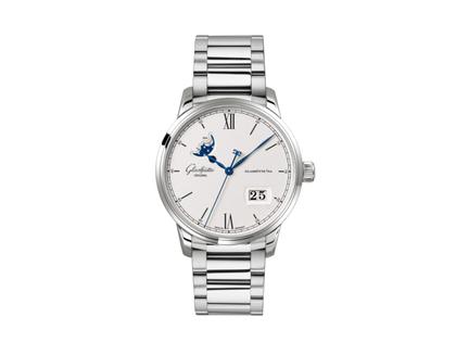 Die Senator Excellence Panoramadatum Mondphase spiegelt mit ihrem reduziertem Design die pure Essenz von Glashütte Orginal wider. Im Inneren schlägt das neue Manufakturkaliber 36, das für Stabilität, eine lange Laufzeit, Präzision und zeitlose Schönheit steht. Dabei kommt ein komplett neu entwickeltes Räderwerk mit enormer Laufruhe und einem optimalen Wirkungsgrad zum Einsatz. Das große Federhaus mit verkleinertem Federkern ermöglicht eine hohe Windungszahl und damit eine Gangdauer von 100 Stunden bei gleichmäßigem Gang. Ebenfalls neu ist das rückerlose Schwingsystem mit Siliziumspirale.