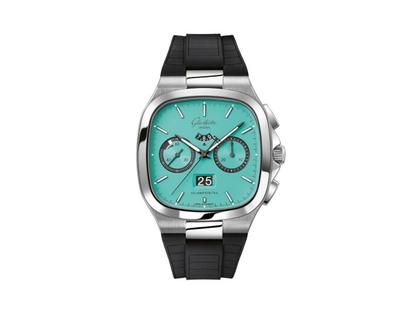 Glashütter Automatikwerk Manufakturkaliber 37-02 hochfein vollendet mit einer Gangreserve von 70 Stunden, Säulenradchronograph mit Flyback-Funktion, poliertes und satiniertes Edelstahlgehäuse mit den Abmessungen von 40,0 x 40,0 mm, Höhe 14,1 mm, verschraubte Edelstahl-Krone, lackiertes mattes Zifferblatt in der Farbe "Swimming Pool" (Türkis), 30-Minuten-Zähler auf 3 Uhr, Panoramadatum auf 6 Uhr, kleine Sekunde auf 9 Uhr mit Gangreserveanzeige, schwarze beschichtete Zeiger und Indizes mit weißer Super-LumiNova® Leuchtmasse, schwarzes Kautschukarmband mit Faltschließe, Saphirglas beidseitig entspiegelt, speziell geformter Saphirglasgehäuseboden für optimalen Tragekomfort, 10 bar wasserdicht - limitiert auf 100 Exemplare weltweit