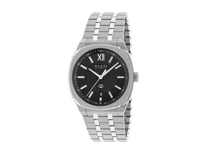 Schweizer Automatikwerk, 38 Stunden Gangreserve, Edelstahlgehäuse poliert / mattiert, Durchmesser 40,0 mm, schwarzes Zifferblatt mit Gucci-Schriftzug und Logo, applizierte Indizes, silberfarbene Zeiger, fünfgliedriges Edelstahlarmband mit Faltschließe, Saphirglas entspiegelt, Glasboden, 5 bar wasserdicht