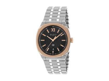 Schweizer Automatikwerk, 38 Stunden Gangreserve, Edelstahlgehäuse poliert / mattiert, Durchmesser 40,0 mm, Lünette mit roségoldener PVD-Beschichtung, schwarzes Zifferblatt mit Gucci-Schriftzug und Logo, applizierte Indizes, roségoldfarbene Zeiger, fünfgliedriges Edelstahlarmband mit Faltschließe, Saphirglas entspiegelt, Glasboden, 5 bar wasserdicht