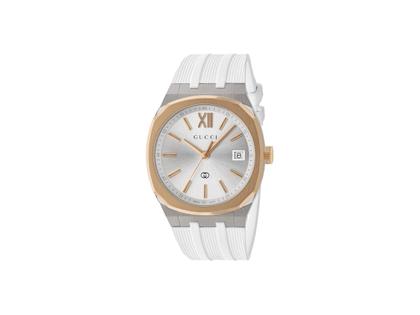 Gucci 25H Quarz Edelstahl 36mm silbernes Zifferblatt weißes Kautschukband YA163439