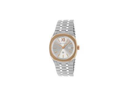 Schweizer Quarzwerk, Edelstahlgehäuse poliert / mattiert, Durchmesser 30,0 mm, Lünette mit roségoldener PVD-Beschichtung, silberfarbenes Zifferblatt mit Gucci-Schriftzug und Logo, Datum auf 3 Uhr, applizierte Indizes, roségoldfarbene Zeiger, fünfgliedriges Edelstahlarmband mit Faltschließe, Saphirglas entspiegelt, verschraubter Edelstahlboden, 5 bar wasserdicht