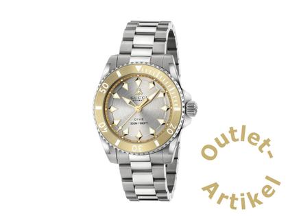 Automatikwerk, 38 Stunden Gangreserve, Edelstahlgehäuse, Durchmesser 40,0 mm, drehbare Lünette mit 750/- Gelbgold Beschichtung, silberfarbenes Zifferblatt mit Bienen-Motiv, Super-LumiNova-Indizes, Edelstahlarmband mit Faltschließe, Saphirglas entspiegelt, verschraubter Edelstahlboden, 30 bar wasserdicht