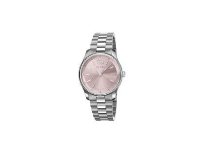 Schweizer Quarzwerk, poliertes Edelstahlgehäuse im Durchmesser von 29,0 mm, silberfarbene Lünette, rosafarbenes Zifferblatt mit zwei Diamant-Indizes, appliziertes GG und Gucci Schriftzug, silberfarbene Zeiger und Indizes, Edelstahlarmband mit Faltschließe, Saphirglas entspiegelt, 5 bar wasserdicht