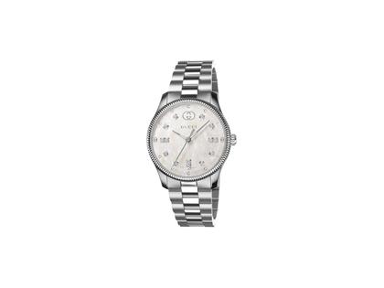 Schweizer Quarzwerk, poliertes Edelstahlgehäuse im Durchmesser von 29,0 mm, silberfarbene Lünette, silberfarbenes Zifferblatt mit 14 Diamant-Indizes, appliziertes GG und Gucci Schriftzug, silberfarbene Zeiger und Indizes, Edelstahlarmband mit Faltschließe, Saphirglas entspiegelt, 5 bar wasserdicht