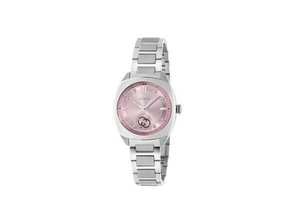Schweizer Quarzwerk, poliertes Edelstahlgehäuse im Durchmesser von 29,0 mm, rosafarbenes Zifferblatt mit acht Diamant-Indizes, silberfarbene Zeiger und Indizes, kleine Sekunde bei 6 Uhr mit Gucci-Logo, Edelstahlarmband mit Faltschließe, Saphirglas entspiegelt, 5 bar wasserdicht