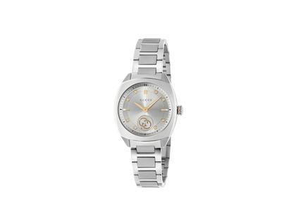 Schweizer Quarzwerk, poliertes Edelstahlgehäuse im Durchmesser von 29,0 mm, silberfarbenes Zifferblatt mit acht Diamant-Indizes, gelbgoldfarbene Zeiger und Indizes, kleine Sekunde bei 6 Uhr mit Gucci-Logo, Edelstahlarmband mit Faltschließe, Saphirglas entspiegelt, 5 bar wasserdicht
