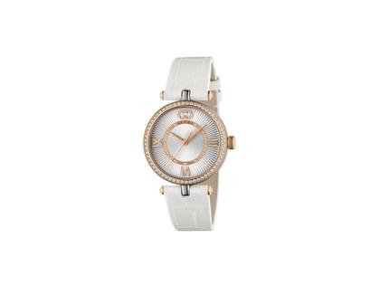 Schweizer Quarzwerk, poliertes Edelstahlgehäuse mit weißen Kunstharzstreifen, Durchmesser von 30,0 mm, Lünette mit 750/- Roségold vergoldet, silber-roségoldfarbenes Guilloche-Zifferblatt mit Gucci-Logo, roségoldfarbene Zeiger, roségoldfarbene römische Ziffern auf 3, 6 und 9 Uhr, Lünette und Zifferblatt mit insgesamt 60 Diamanten zusammen 0,640ct, weißes Alligator-Lederarmband mit Dornschließe, Saphirglas entspiegelt, 5 bar wasserdicht