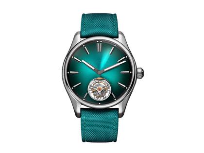 Gehäuse aus Edelstahl, Durchmesser 42,8 mm, Automatik, Kaliber HMC 804 mit automatischem Aufzug, Tourbillon mit Double Hairspring, Zifferblatt Fumé Blue Lagoon mit Sonnenschliff, türkises Textilband mit Faltschließe, Saphirglas, Saphirglasboden, 12 bar wasserdicht