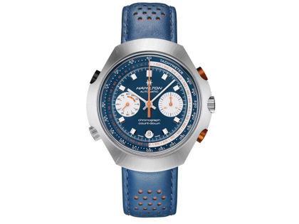Die Chrono-Matic 50 ist aus ihrem historischen Vorfahren neu gedacht. Die auf 150 Stücke limitierte Chrono-Matic 50 verfügt über ein markantes Palet aus kontrastierenden Farben in Blau und Orange, das die dynamischen und elektrisierenden Facetten der Geschwindigkeit widerspiegelt. Sein Renngeist wird mit einer Tachymeter-Indikation und einem perforierten, zweifarbigen Lederarmband hervorgehoben. Angetrieben durch die Automatikwerk H-31, mit einem 48-mm-Zifferblatt und einem authentischen Edelstahlgehäuse im 70er-Jahre-Stil, macht die Chrono-Matic 50 ein beeindruckendes Statement.