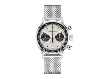 rundes Edelstahlgehäuse, 40 mm Durchmesser, Automatik, weißes Zifferblatt, schwarze Totalistoren, Kaliber H-31, basierend auf ETA 7753, mit 60 Stunden Gangreserve, American Classic Intra-Matic Auto Chrono, Saphirglas, 10 bar wasserdicht, Metallband mit Faltschließe