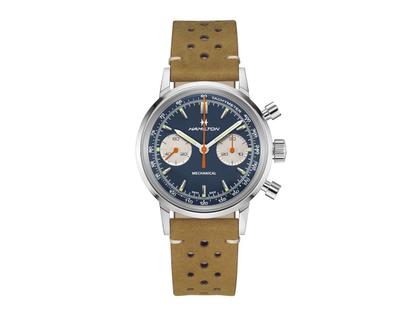 Hamilton American Classic Intra-Matic Chronograph H Handaufzug Edelstahl 40mm blaues Zifferblatt braunes Lederband