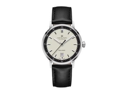 Automatik Kaliber H-10 mit 80 Stunden Gangreserve, rundes Edelstahlgehäuse, 40 mm im Durchmesser, beiges Zifferblatt, Intra-Matic Auto, schwarzes Lederband mit Dornschließe, Saphirglas, 5 bar wasserdicht