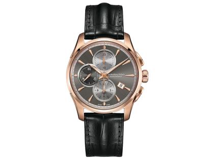 Hamilton Jazzmaster Auto Chrono Edelstahl PVD-Roségold 42mm graues Zifferblatt schwarzes Lederband
