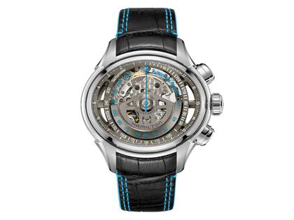 Crossover, ovale Automatik Herrenuhr mit Wendegehäuse aus Edelstahl im Maß von 53 mm x 44 mm, silberfarbenes Zifferblatt mit Stunde, Minute und Sekunde, Day Date Funtion, doppelter Chronographenzeiger, Pulsometer, Tachymeter, Telemeter, Stoppfunktion, schwarzes Lederband mit türkisfarbener Doppelziernaht und Faltschließe, Saphirglas, 5 bar wasserdicht