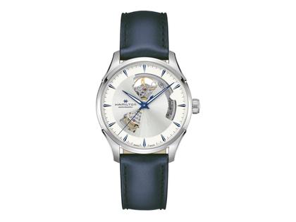 Hamilton Jazzmaster Open Heart Automatik Edelstahl 40mm silbernes Zifferblatt blaues Lederband