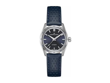 Die Jazzmaster Performer Serie überzeugt durch ihre ausdrucksstarke sportliche Optik und ist wie geschaffen für alle, die weder auf Funktion noch auf Stil verzichten möchten. Diese Jazzmaster Performer Automatic wird vom Automatikwerk H-10 mit 80 Stunden Gangreserve angetrieben. Sie besitzt ein 34-mm-Edelstahlgehäuse, das durch ein schlicht gehaltenes dunkelblaues Zifferblatt und ein dazu passendes blaues perforiertes Lederarmband im Rennsportstil abgerundet wird.