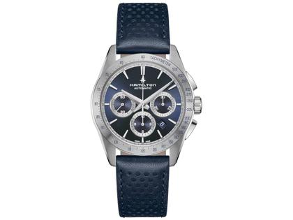 Die Jazzmaster Performer Serie überzeugt durch ihre ausdrucksstarke sportliche Optik und ist wie geschaffen für alle, die weder auf Funktion noch auf Stil verzichten möchten. Diese Jazzmaster Performer Automatik Chronograph wird vom automatischen Chronographenwerk H-31 mit 60 Stunden Gangreserve angetrieben. Sie besitzt ein 42-mm-Edelstahlgehäuse, das durch ein elegantes blaues Zifferblatt und ein dazu passendes blaues perforiertes Lederarmband im Rennsportstil abgerundet wird.