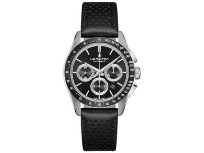Die Jazzmaster Performer Serie überzeugt durch ihre ausdrucksstarke sportliche Optik und ist wie geschaffen für alle, die weder auf Funktion noch auf Stil verzichten möchten. Diese Jazzmaster Performer Automatik Chronograph wird vom automatischen Chronographenwerk H-31 mit 60 Stunden Gangreserve angetrieben. Sie besitzt ein 42-mm-Edelstahlgehäuse, das durch ein elegantes schwarzes Zifferblatt und ein dazu passendes schwarzes perforiertes Lederarmband im Rennsportstil abgerundet wird.