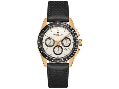 Hamilton Jazzmaster Performer Auto Chrono Edelstahl PVD-Roségold 42mm weißes Zifferblatt schwarzes Lederband