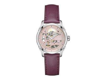 Hamilton Jazzmaster Skeleton Lady Auto Edelstahl 36mm rosa Zifferblatt violettes Lederband