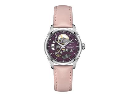 Hamilton Jazzmaster Skeleton Lady Auto Edelstahl 36mm violettes Zifferblatt rosa Lederband