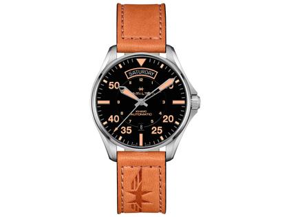 rundes Edelstahlgehäuse, Automatik, 42 mm Durchmesser, Khaki Aviation Khaki Pilot Day Date Auto, Kaliber H-40, Gangreserve 80 Stunden, schwarzes Zifferblatt mit Tagesanzeige auf 6 Uhr und Wochentag bei 12 Uhr, cognacfarbenes Lederband mit Doppeldornschließe, Saphirglas, Saphirglasboden, 10 bar wasserdicht