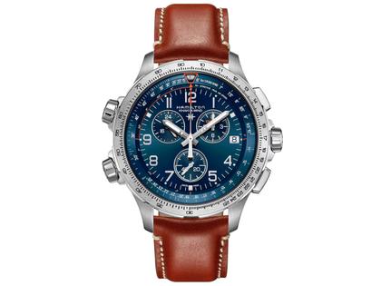 Hamilton Khaki Aviation X-Wind GMT Chrono Quartz Edelstahl 46mm blaues Zifferblatt braunes Lederband