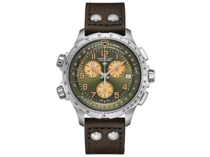 Hamilton Khaki Aviation X-Wind GMT Chrono Quartz Edelstahl 46mm grünes Zifferblatt braunes Lederband
