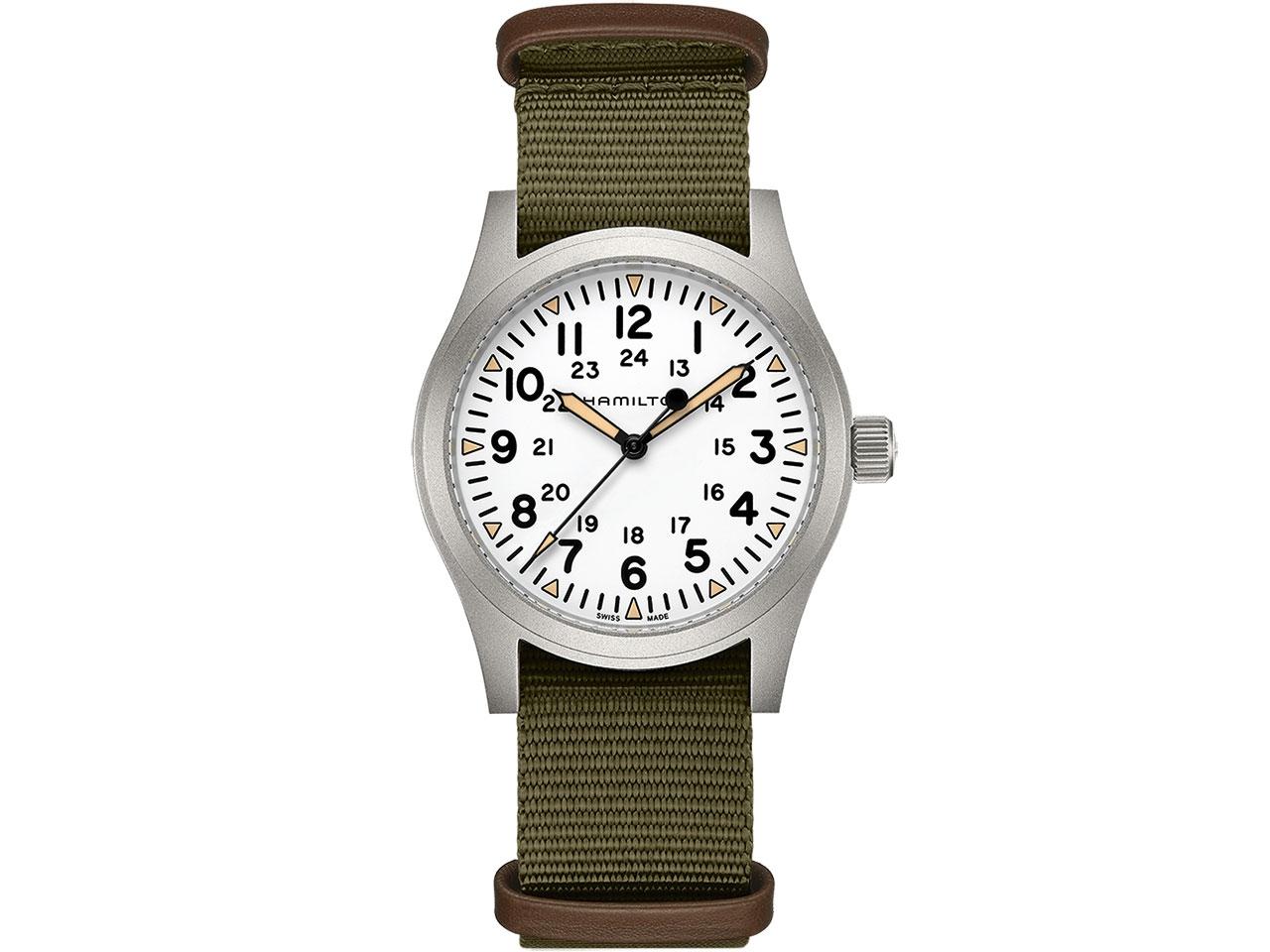 Hamilton Khaki Field Mechanical Handaufzug Edelstahl 42mm weißes Zifferblatt olivgrünes Textilband