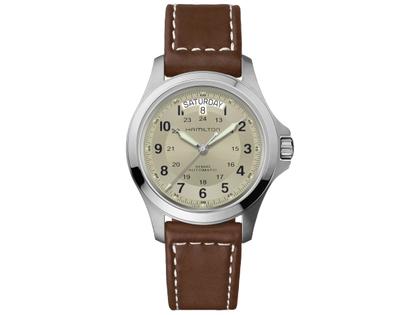 Hamilton Khaki Field King Auto Edelstahl 40mm beiges Zifferblatt braunes Lederband