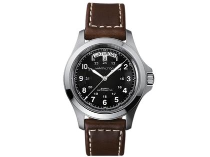 Khaki King Automatik, rund, Edelstahgehäuse, Durchmesser 40 mm, schwarzes Zifferblatt, Saphirglas, 5 bar wasserdicht, Datum und Wochentag, braunes Lederband
