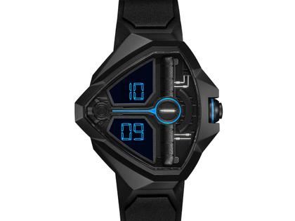 Schweizer Quarzwerk, futuristisch-geformtes Edelstahlgehäuse Schwarz-PVD beschichtet mit den Abmessungen von 51,0 mm x 47,0 mm, Höhe 13,8 mm, schwarzes Zifferblatt mit digitaler blauer Anzeige, schwarzes Kautschukband mit Dornschließe, entspiegeltes Saphirglas, Edelstahlgehäuseboden, 10 bar wasserdicht - limitiert auf 2000 Exemplare weltweit