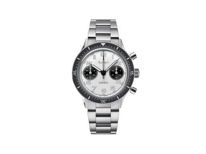 Chronograph mit zentraler Stoppsekunde, Handaufzug Werk Sellita SW510 M, Hanhart Werkdämpfung als zusätzlicher Stoßschutz, Gangreserve von 58 Stunden, antimagnetisches Gehäuse aus poliertem / satiniertem Edelstahl im Durchmesser von 39,0 mm, Höhe 13,5 mm, Krone mit distinktiven Hanhart „h“ des historischen Flügellogos, Lünette mit schwarzer Keramik-Einlage, beidseitig mit 60 Klicks drehbar, weißes Zifferblatt mit historischem Hanhart-Flügel-Logo, silberfarbene Zeiger mit weißer Super-LumiNova® X1 Leuchtmasse, arabische Ziffern und Indizes mit weißer Super-LumiNova® X1 Leuchtmasse, 30-Minuten-Zähler auf 3 Uhr, kleine Sekunde auf 9 Uhr, weiße Minuterie auf dem Zifferblatt-Außenring, sEdelstahlband mit Faltschließe mit Feineinstellung, Saphirglas innen entspiegelt, verschraubter Gehäuseboden mit Gravur der Seriennummer, 10 bar wasserdicht