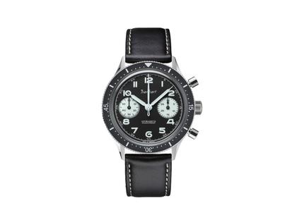 Hanhart 415 ES Panda Reserve Chronograph Handaufzug Edelstahl 39mm schwarzes Zifferblatt schwarzes Lederband