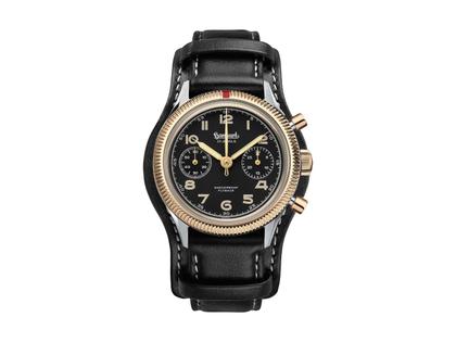 Hanhart 417 C Flyback Bicolor Chronograph Handaufzug Edelstahl 39mm schwarzes Zifferblatt schwarzes Lederband limitiert
