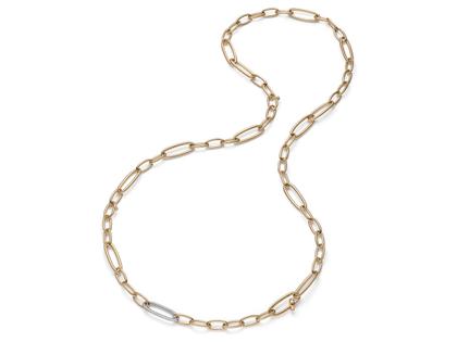 2 in 1: Diese verspielte lange Kette besteht aus einem Collier (77 cm) und einem separaten Armband (20 cm). Das Collier und das Armband können sowohl zusammen als auch separat getragen werden. Als lange Kette, als kürzeres Collier oder auch als Y-Kette und der Möglichkeit einen Anhänger einzuhängen. Dieses Schmuckstück passt sich ganz dem Outfit und dem Anlass an. Handgefertigt aus 18 Karat Gold mit einer Breite von 11 mm und einem wunderschönen 1,09 ct. Brillant-Pavé in einem Kettenelement. Zwei unsichtbare Klappverschlüsse vollenden das reduzierte Design. Die zwei Brillanten in den Verschlüssen zeigen der Trägerin die Stellen, an welchen sie ihr Schmuckstück bequem öffnen kann.