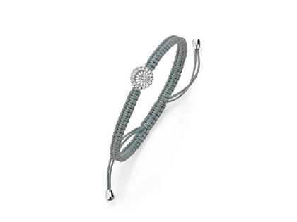 Makramee-Armband aus einem anthrazitfarbenen Stoffband, Anhänger aus 750/- Weißgold poliert, 16 kleine und 1 großer Brillant zusammen 0,244 ct TW (G) si, Mittelstein beweglich, verstellbarer Verschluss