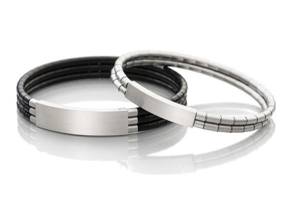 Armband dreireihig aus Edelstahl schwarz beschichtet, 950/- Platin, 10 mm breit (im Bild links)
