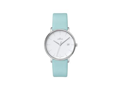 Quarzwerk J645.36, Edelstahlgehäuse, 34 mm Durchmesser, Höhe 7 mm, weißes Zifferblatt mit Datum bei 3 Uhr, Zeiger mit umweltfreundlicher Leuchtmasse, hellblaues Lederband mit Schnellwechselfunktion und Dornschließe, 17 mm Bandanstoß, entspiegeltes Saphirglas, 4-fach verschraubter Edelstahlboden, 5 bar wasserdicht