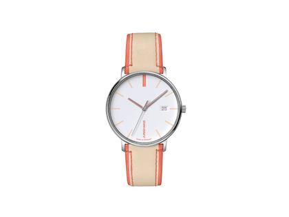 Quarzwerk J645.36, Edelstahlgehäuse, Durchmesser 34,1 mm, Höhe 7,0 mm, mattweißes Zifferblatt mit Datum bei 3 Uhr, Zeiger mit umweltfreundlicher Leuchtmasse, orangenes Lederarmband mit Schnellwechselfunktion und Dornschließe, Bandanstoß 17,0 mm, entspiegeltes Saphirglas, 4-fach verschraubter Edelstahlboden, 5 bar wasserdicht