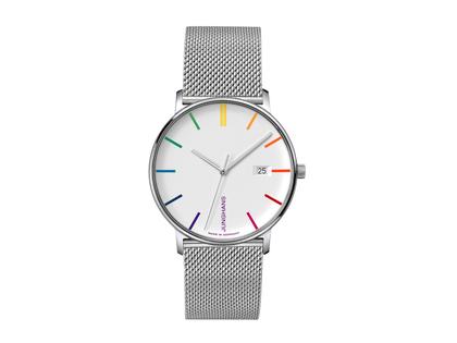 Quarzwerk J645.37, poliertes Edelstahlgehäuse im Durchmesser von 39,9 mm, Höhe 7,0 mm, mattweißes Zifferblatt, Datum auf 3 Uhr, silberfarbener Stunden- und Minutenzeiger mit umweltfreundlicher weißer Leuchtmasse, silberfarbener Sekundenzeiger, verschiedenfarbige Indizes, Edelstahl-Milanaisearmband mit Faltschließe, Saphirglas entspiegelt, 4-fach verschraubter Edelstahlboden, 5 bar wasserdicht - auf 1000 Exemplare limitiert