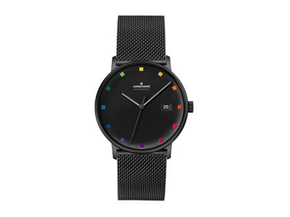 Mit der FORM A Bauhaus feiert Junghans 100 Jahre Bauhaus in Dessau. Neben Formen waren Farben ein wesentlicher Bestandteil der Lehren am Bauhaus. Das Zifferblatt dieser auf 1000 Exemplare limitierten Uhr zeigt einen Farbkreis auf den 12 Stundenmarkierungen, der auf den Primärfarben basiert. Durch die Fenster eines Bauhaus-Abbilds auf dem Gehäuseboden kann man sehen, wie das mechanische Werk im Inneren arbeitet. Die FORM ist nicht nur eine Uhr für besondere Anlässe, sondern eine außergewöhnliche Uhr für jeden Moment. Ihr mattschwarzes Zifferblatt mit zwölf verschiedenfarbigen Stundenindizes, angeordnet im Farbverlauf, wie die Farben eines Regenbogens und das ergonomisch gestaltete Gehäuse macht sie zu einem echten Blickfang. Guter Stil ist zeitlos, und genau deshalb präsentiert sich die schlichte und moderne FORM dezent und zurückhaltend – ein markanter Zeitmesser für jede Gelegenheit.