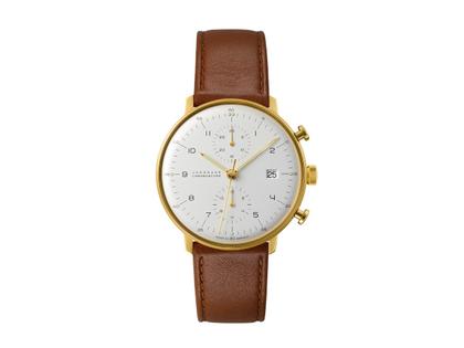 Junghans Max Bill Chronoscope Automatik Edelstahl PVD-Gelbgold 40mm weißes Zifferblatt braunes Lederband