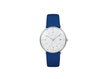 Junghans Max Bill Damen Quarz Edelstahl 33mm weißes Zifferblatt blaues Lederband