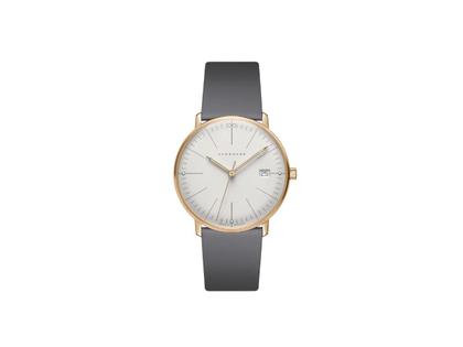 Junghans Max Bill Quarz Edelstahl PVD-Gelbgold 33mm graues Zifferblatt graues Lederband