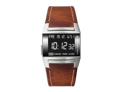 Multifrequenz-Funkwerk J604.64, Stoppfunktion, Edelstahlgehäuse, Maße 38,0 x 36,0 mm, Höhe 10,7 mm, digitales Zifferblatt mit schwarzem Rand und Beleuchtung, braunes Lederarmband mit Dornschließe, Saphirglas, Gehäuseboden mit Jubiläumsgravur, 5 bar wasserdicht - limitiert auf 120 Exemplare weltweit