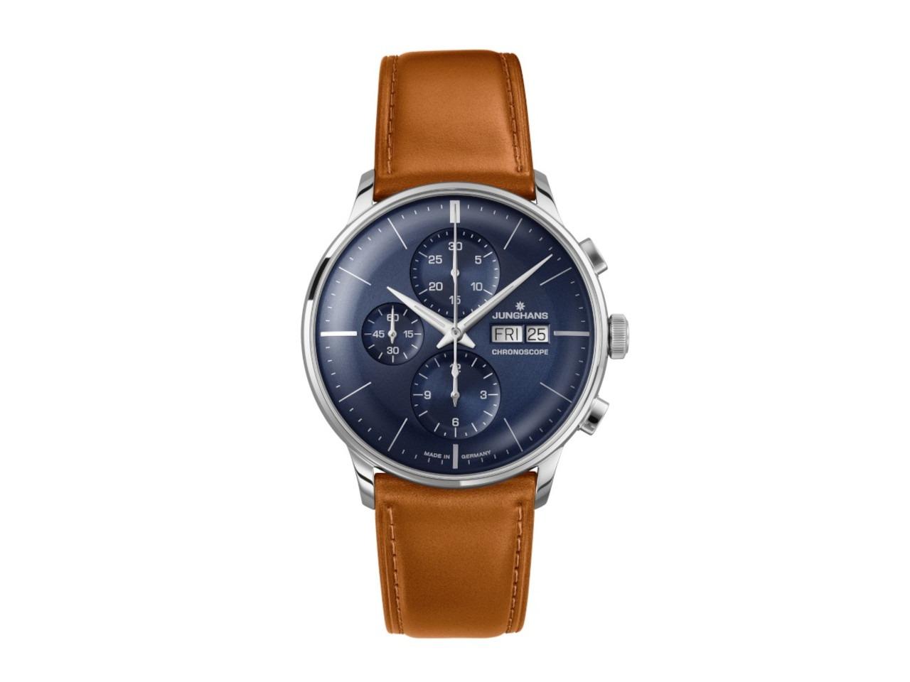 Junghans Meister Chronoscope Automatik Edelstahl 40mm blaues Zifferblatt braunes Lederband